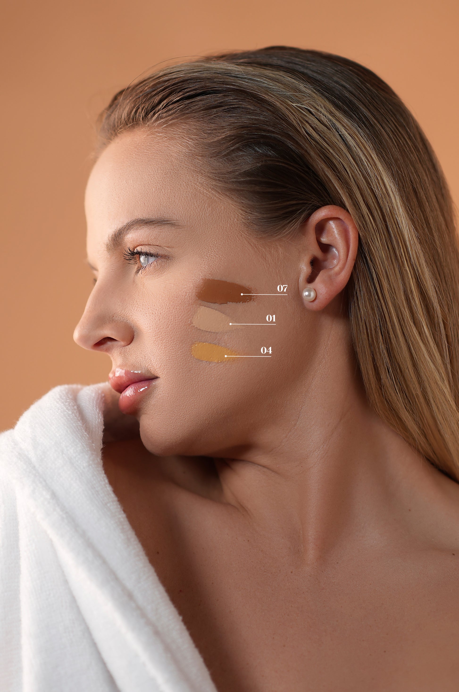 USO: Exprima una cantidad adecuada de base líquida, extiéndala uniformemente sobre el rostro y luego dé golpecitos con herramientas de belleza hasta que se ajuste al rostro.